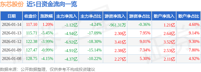 证券之星消息,截至2026年1月14日收盘,东芯股份(688110)报收于117.1元,上涨1.2%,换手率5.05%,成交量22.32万手,成交额26.36亿元。