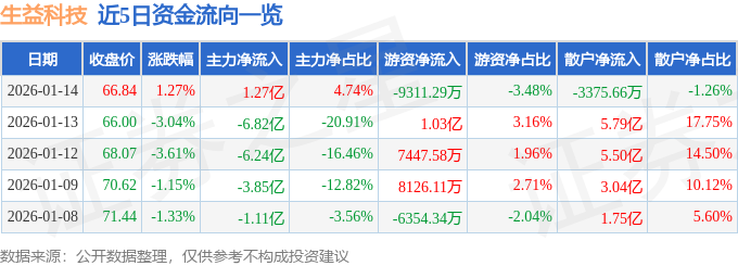1月14日的资金流向数据方面,主力资金净流入1.27亿元,占总成交额4.74%,游资资金净流出9311.29万元,占总成交额3.48%,散户资金净流出3375.66万元,占总成交额1.26%。