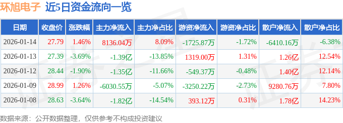 证券之星消息,截至2026年1月14日收盘,环旭电子(601231)报收于27.79元,上涨1.46%,换手率1.59%,成交量36.24万手,成交额10.06亿元。