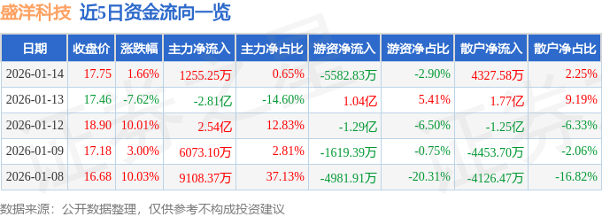 证券之星消息,截至2026年1月14日收盘,盛洋科技(603703)报收于17.75元,上涨1.66%,换手率25.24%,成交量104.75万手,成交额19.24亿元。