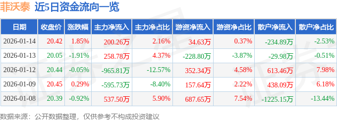 1月14日的资金流向数据方面,主力资金净流入200.26万元,占总成交额2.16%,游资资金净流入34.63万元,占总成交额0.37%,散户资金净流出234.89万元,占总成交额2.53%。