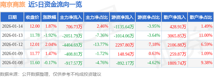 证券之星消息,截至2026年1月14日收盘,南京商旅(600250)报收于12.0元,上涨1.87%,换手率7.77%,成交量24.13万手,成交额2.87亿元。