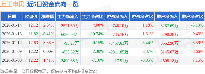 1月14日的资金流向数据方面,主力资金净流入2521.59万元,占总成交额4.0%,游资资金净流入746.1万元,占总成交额1.18%,散户资金净流出3267.69万元,占总成交额5.19%。