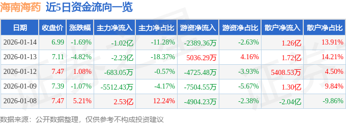 证券之星消息,截至2026年1月14日收盘,海南海药(000566)报收于6.99元,下跌1.69%,换手率9.95%,成交量129.03万手,成交额9.08亿元。