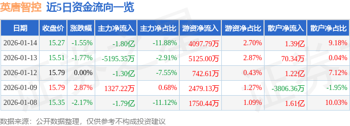 证券之星消息,截至2026年1月14日收盘,英唐智控(300131)报收于15.27元,下跌1.55%,换手率9.39%,成交量97.82万手,成交额15.18亿元。