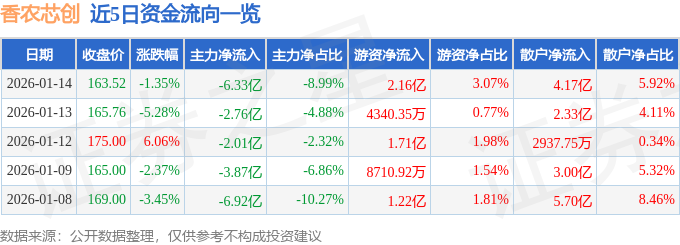 证券之星消息,截至2026年1月14日收盘,香农芯创(300475)报收于163.52元,下跌1.35%,换手率9.41%,成交量41.89万手,成交额70.41亿元。