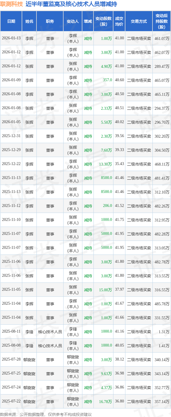 联测科技近半年内的董监高及核心技术人员增减持详情如下: