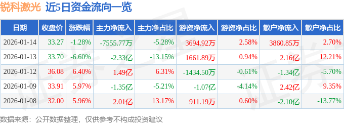 证券之星消息,截至2026年1月14日收盘,锐科激光(300747)报收于33.27元,下跌1.28%,换手率8.35%,成交量42.52万手,成交额14.3亿元。