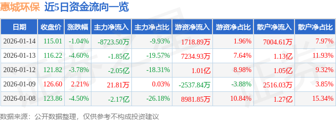 证券之星消息,截至2026年1月14日收盘,惠城环保(300779)报收于115.01元,下跌1.04%,换手率4.73%,成交量7.62万手,成交额8.79亿元。