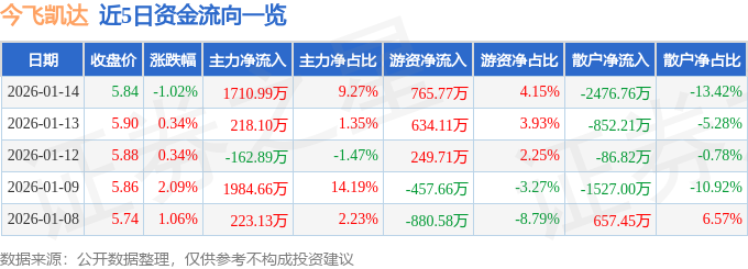 证券之星消息,截至2026年1月14日收盘,今飞凯达(002863)报收于5.84元,下跌1.02%,换手率5.26%,成交量31.53万手,成交额1.85亿元。