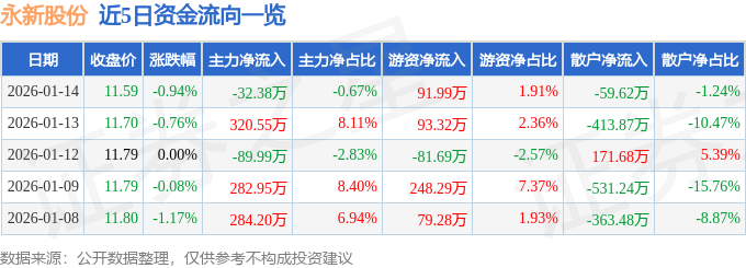 1月14日的资金流向数据方面,主力资金净流出32.38万元,占总成交额0.67%,游资资金净流入91.99万元,占总成交额1.91%,散户资金净流出59.62万元,占总成交额1.24%。