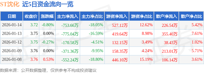 证券之星消息,截至2026年1月14日收盘,ST沈化(000698)报收于3.72元,下跌0.8%,换手率1.42%,成交量11.14万手,成交额4176.5万元。