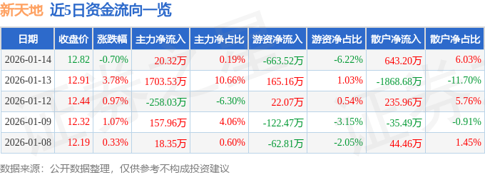 证券之星消息,截至2026年1月14日收盘,新天地(301277)报收于12.82元,下跌0.7%,换手率2.12%,成交量8.29万手,成交额1.07亿元。