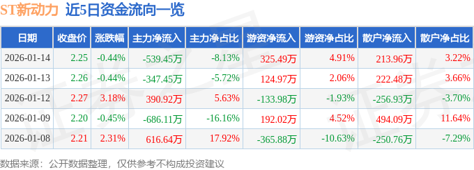 证券之星消息,截至2026年1月14日收盘,ST新动力(300152)报收于2.25元,下跌0.44%,换手率4.11%,成交量29.31万手,成交额6635.84万元。