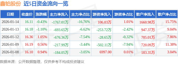证券之星消息,截至2026年1月14日收盘,鑫铂股份(003038)报收于16.11元,下跌0.43%,换手率3.93%,成交量6.51万手,成交额1.05亿元。