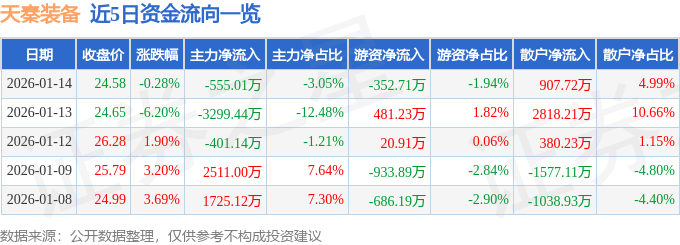 证券之星消息,截至2026年1月14日收盘,天秦装备(300922)报收于24.58元,下跌0.28%,换手率5.91%,成交量7.37万手,成交额1.82亿元。