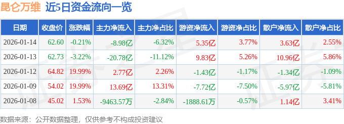 证券之星消息,截至2026年1月14日收盘,昆仑万维(300418)报收于62.6元,下跌0.21%,换手率17.59%,成交量220.66万手,成交额142.07亿元。