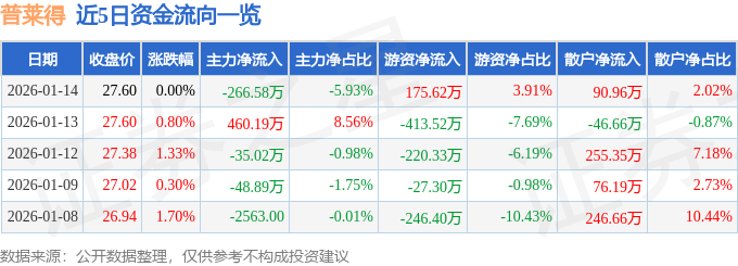证券之星消息,截至2026年1月14日收盘,普莱得(301353)报收于27.6元,上涨0.0%,换手率5.09%,成交量1.62万手,成交额4492.65万元。