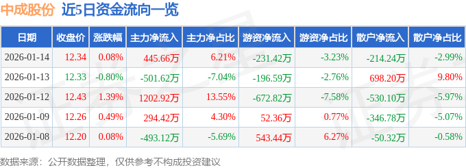 证券之星消息,截至2026年1月14日收盘,中成股份(000151)报收于12.34元,上涨0.08%,换手率1.89%,成交量5.81万手,成交额7174.5万元。