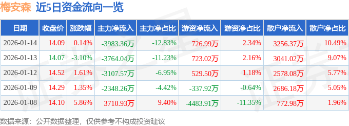 1月14日的资金流向数据方面,主力资金净流出3983.36万元,占总成交额12.83%,游资资金净流入726.99万元,占总成交额2.34%,散户资金净流入3256.37万元,占总成交额10.49%。