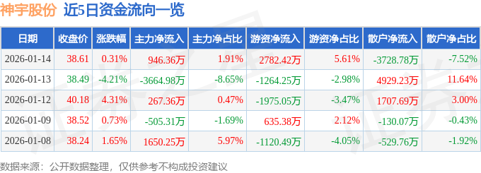 证券之星消息,截至2026年1月14日收盘,神宇股份(300563)报收于38.61元,上涨0.31%,换手率10.24%,成交量12.71万手,成交额4.96亿元。