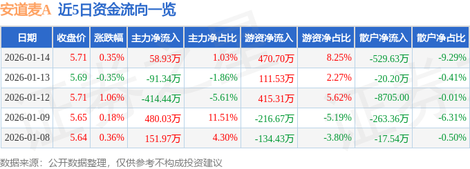1月14日的资金流向数据方面,主力资金净流入58.93万元,占总成交额1.03%,游资资金净流入470.7万元,占总成交额8.25%,散户资金净流出529.63万元,占总成交额9.29%。