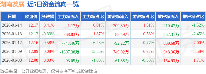 证券之星消息,截至2026年1月14日收盘,湖南发展(000722)报收于12.17元,上涨0.41%,换手率2.45%,成交量11.37万手,成交额1.38亿元。