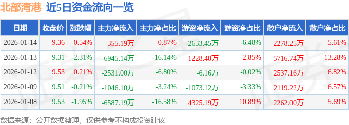 证券之星消息,截至2026年1月14日收盘,北部湾港(000582)报收于9.36元,上涨0.54%,换手率2.15%,成交量43.22万手,成交额4.06亿元。