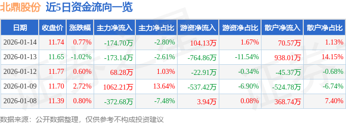 证券之星消息,截至2026年1月14日收盘,北鼎股份(300824)报收于11.74元,上涨0.77%,换手率1.68%,成交量5.32万手,成交额6248.84万元。