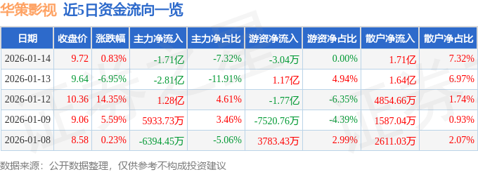 证券之星消息,截至2026年1月14日收盘,华策影视(300133)报收于9.72元,上涨0.83%,换手率14.72%,成交量237.29万手,成交额23.41亿元。