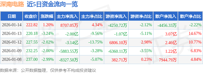 证券之星消息,截至2026年1月14日收盘,深南电路(002916)报收于222.82元,上涨1.2%,换手率1.36%,成交量9.02万手,成交额20.08亿元。