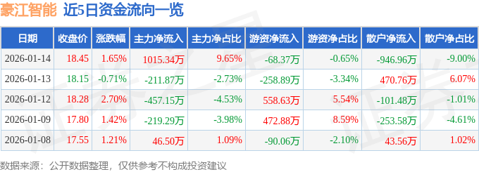 证券之星消息,截至2026年1月14日收盘,豪江智能(301320)报收于18.45元,上涨1.65%,换手率8.35%,成交量5.69万手,成交额1.05亿元。