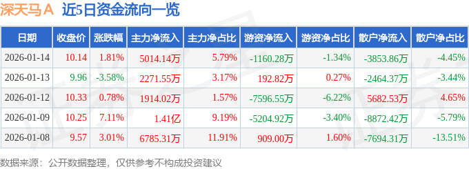 1月14日的资金流向数据方面,主力资金净流入5014.14万元,占总成交额5.79%,游资资金净流出1160.28万元,占总成交额1.34%,散户资金净流出3853.86万元,占总成交额4.45%。