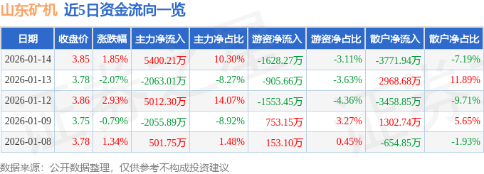证券之星消息,截至2026年1月14日收盘,山东矿机(002526)报收于3.85元,上涨1.85%,换手率7.58%,成交量134.31万手,成交额5.24亿元。