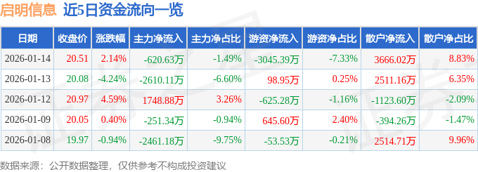 证券之星消息,截至2026年1月14日收盘,启明信息(002232)报收于20.51元,上涨2.14%,换手率4.97%,成交量20.29万手,成交额4.15亿元。