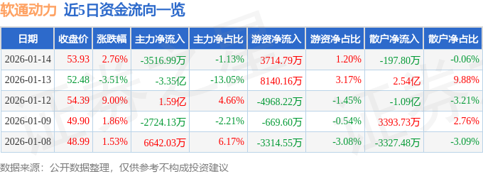 证券之星消息,截至2026年1月14日收盘,软通动力(301236)报收于53.93元,上涨2.76%,换手率7.34%,成交量57.47万手,成交额31.03亿元。