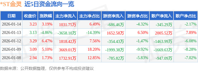 证券之星消息,截至2026年1月14日收盘,*ST金灵(300091)报收于3.23元,上涨3.19%,换手率3.34%,成交量49.26万手,成交额1.59亿元。