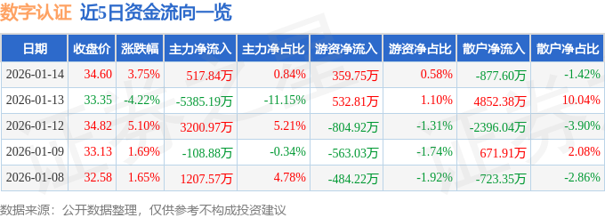 证券之星消息,截至2026年1月14日收盘,数字认证(300579)报收于34.6元,上涨3.75%,换手率6.77%,成交量17.77万手,成交额6.16亿元。