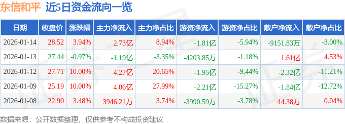 证券之星消息,截至2026年1月14日收盘,东信和平(002017)报收于28.52元,上涨3.94%,换手率18.35%,成交量106.47万手,成交额30.48亿元。