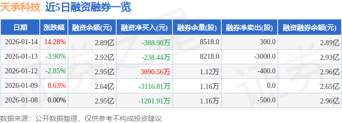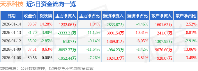 证券之星消息,截至2026年1月14日收盘,天承科技(688603)报收于93.37元,上涨14.28%,换手率15.24%,成交量7.23万手,成交额6.35亿元。