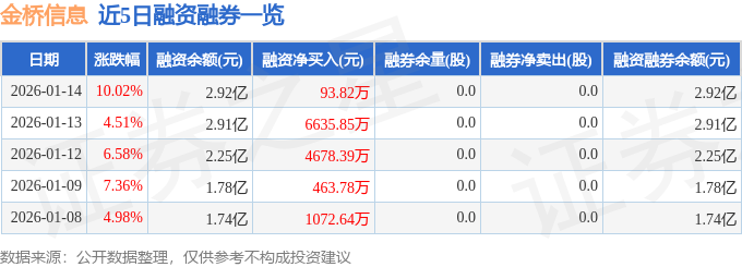 金桥信息融资融券信息显示,融资方面,当日融资买入1.9亿元,融资偿还1.89亿元,融资净买入93.82万元,连续3日净买入累计1.14亿元。融券方面,融券卖出0.0股,融券偿还0.0股,融券余量0.0股,融券余额0.0万元。融资融券余额2.92亿元。