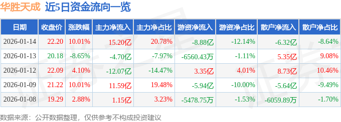 证券之星消息,截至2026年1月14日收盘,华胜天成(600410)报收于22.2元,上涨10.01%,涨停,换手率31.18%,成交量341.91万手,成交额73.13亿元。