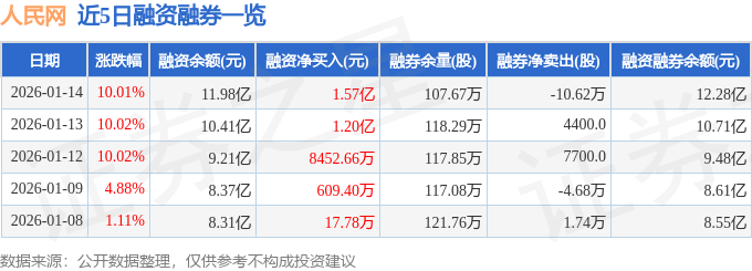 证券之星消息,截至2026年1月14日收盘,人民网(603000)报收于28.03元,上涨10.01%,已连续涨停3天,换手率9.92%,成交量109.7万手,成交额29.87亿元。