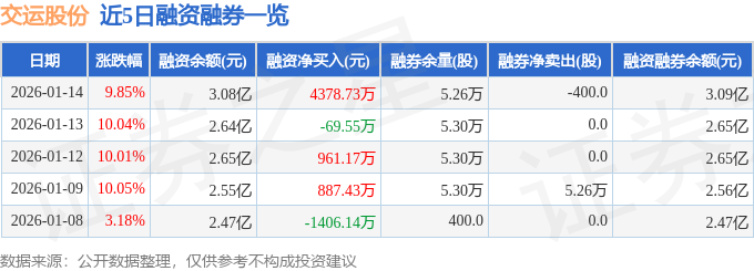 证券之星消息,截至2026年1月14日收盘,交运股份(600676)报收于9.03元,上涨9.85%,换手率14.97%,成交量153.96万手,成交额13.67亿元。