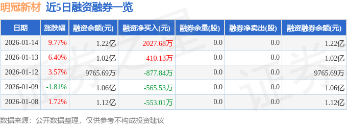 明冠新材融资融券信息显示,融资方面,当日融资买入5998.82万元,融资偿还3971.14万元,融资净买入2027.68万元。融券方面,融券卖出0.0股,融券偿还0.0股,融券余量0.0股,融券余额0.0万元。融资融券余额1.22亿元。