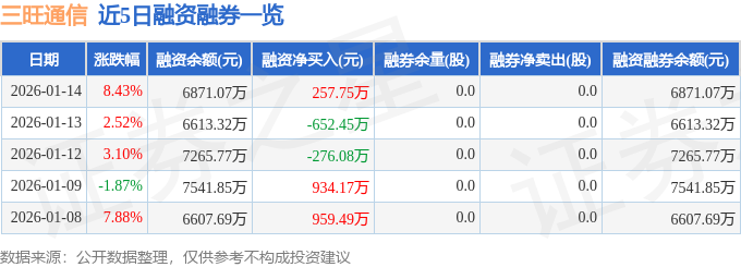 三旺通信融资融券信息显示,融资方面,当日融资买入2977.85万元,融资偿还2720.1万元,融资净买入257.75万元。融券方面,融券卖出0.0股,融券偿还0.0股,融券余量0.0股,融券余额0.0万元。融资融券余额6871.07万元。