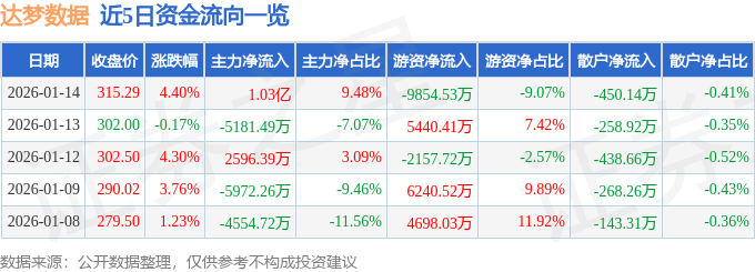 证券之星消息,截至2026年1月14日收盘,达梦数据(688692)报收于315.29元,上涨4.4%,换手率4.65%,成交量3.4万手,成交额10.87亿元。