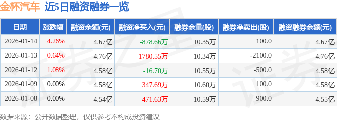 证券之星消息,截至2026年1月14日收盘,金杯汽车(600609)报收于4.9元,上涨4.26%,换手率5.31%,成交量69.31万手,成交额3.33亿元。