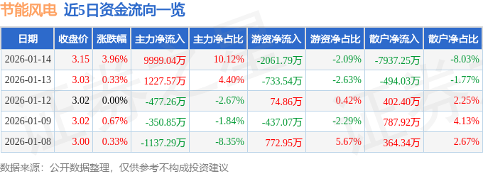 证券之星消息,截至2026年1月14日收盘,节能风电(601016)报收于3.15元,上涨3.96%,换手率5.28%,成交量313.38万手,成交额9.88亿元。