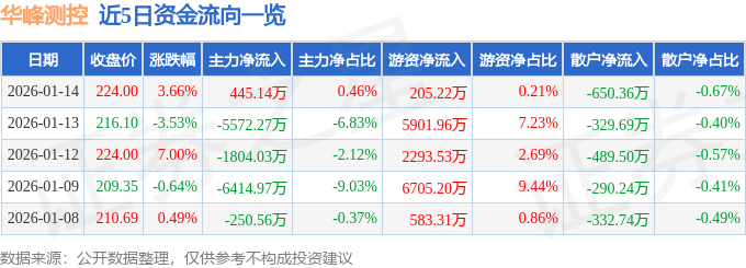 证券之星消息,截至2026年1月14日收盘,华峰测控(688200)报收于224.0元,上涨3.66%,换手率3.21%,成交量4.34万手,成交额9.67亿元。